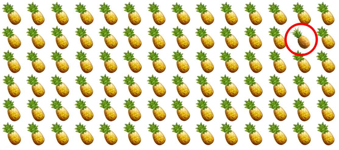 Στην εικόνα υπάρχουν πολλοί ανανάδες, που εμφανίζονται σε διάφορες σειρές. Ο στόχος σας είναι να βρείτε έναν ιδιαίτερο ανανά που διαφέρει από όλους τους άλλους.