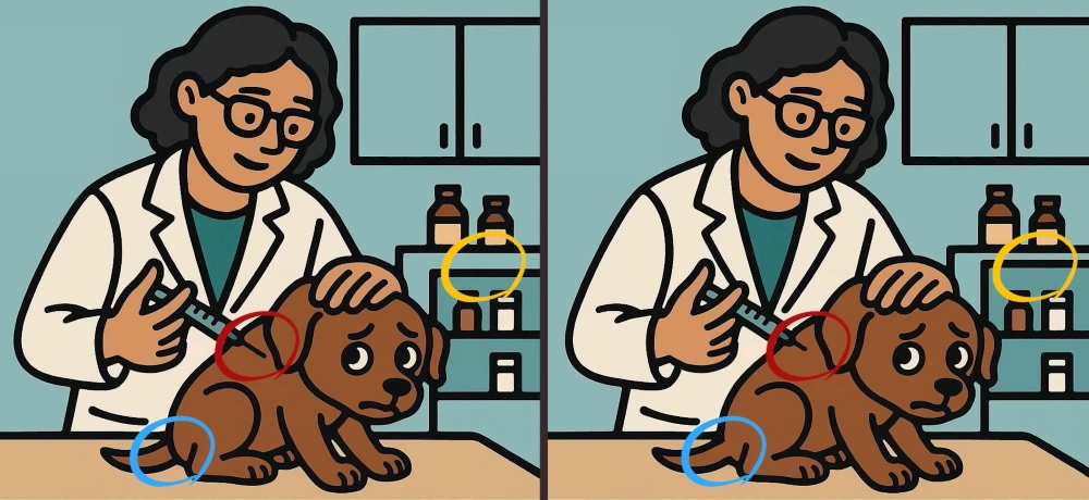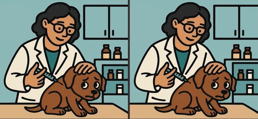 Είστε λοιπόν έτοιμοι για την επόμενη πρόκληση; Ρίξτε μια προσεκτική ματιά σε δύο εικόνες ενός κτηνιάτρου που κάνει ένεση σε ένα σκύλο. Με την πρώτη ματιά οι εικόνες μπορεί να φαίνονται ίδιες, αλλά υπάρχουν 3 μικρές διαφορές. Πιστεύετε ότι μπορείτε να τις βρείτε όλες σε 63 δευτερόλεπτα; Δοκιμάστε το και δοκιμάστε την οπτική σας οξύτητα!